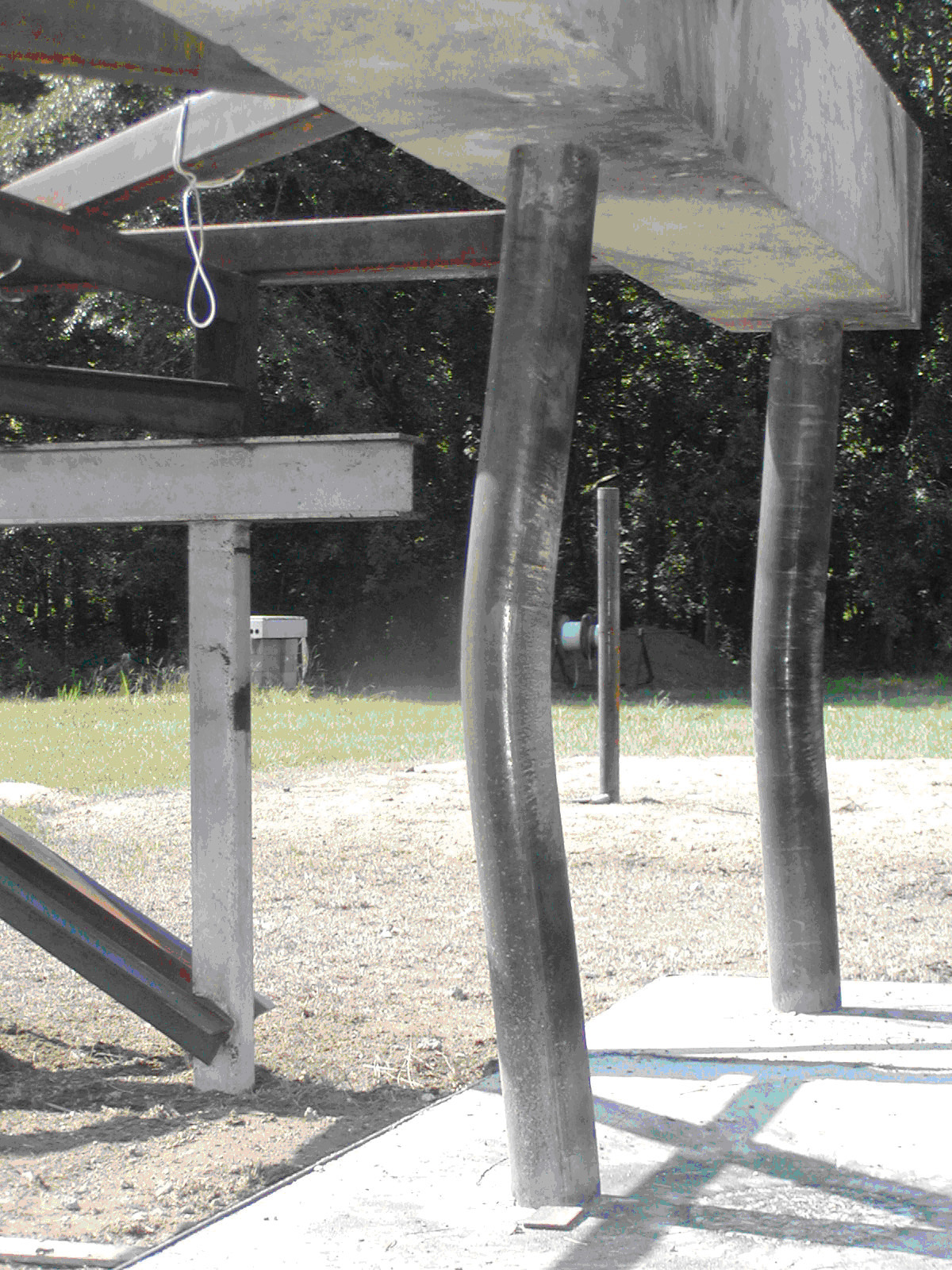 Permanent bends, but no significant damage, were experienced by the bridge piers as a result of the test blasts, according to Bruneau. "However, expert opinion and results from software modeling indicate that a comparable concrete pier, reinforced with rebar, would have exhibited significant breaching of the concrete, resulting in failure of the bridge," he says.