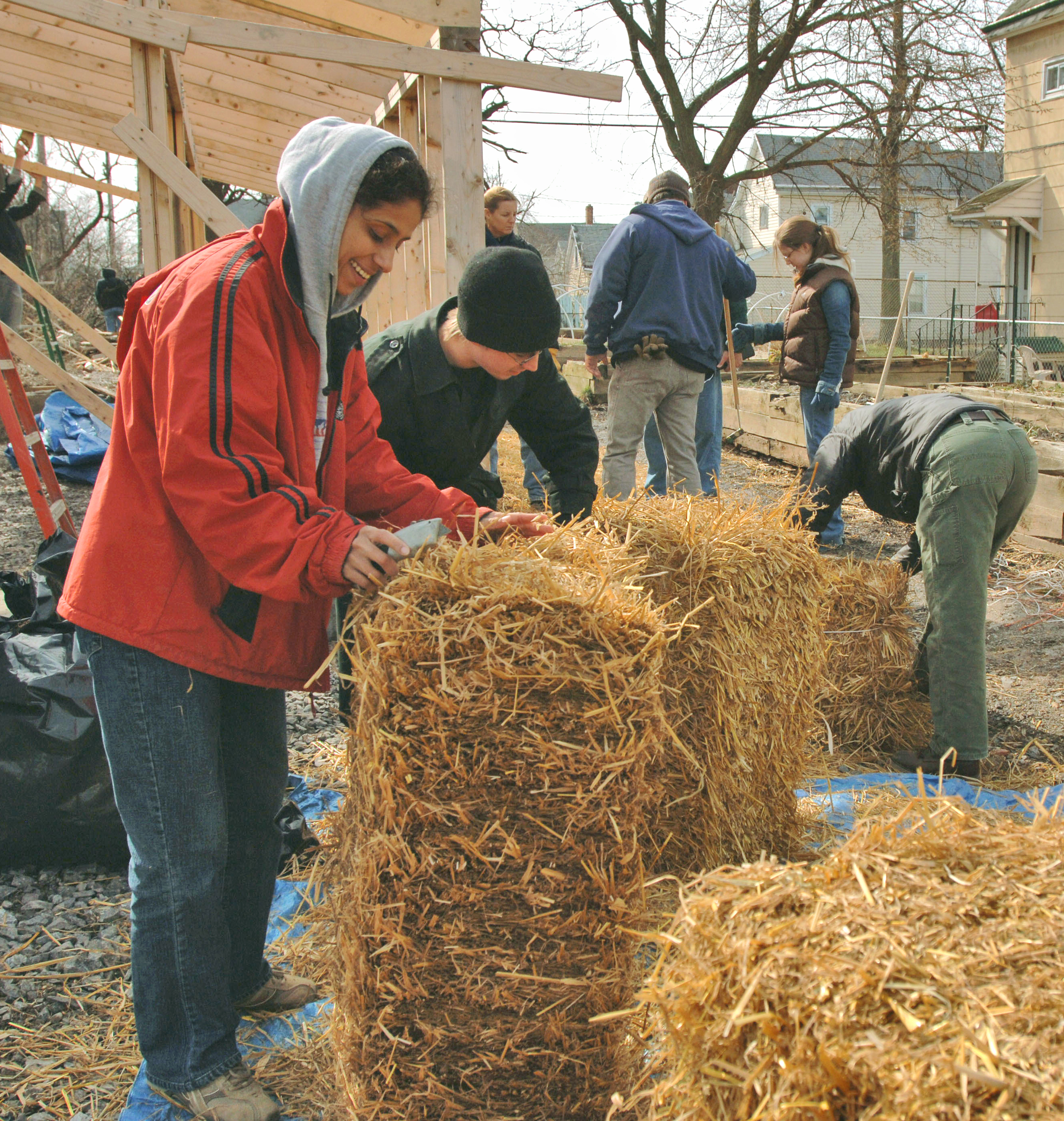 University at Buffalo architecture students and community members -- cold, covered in mud and stuck with hay -- recently raised 130 50-pound "two-string" straw bales (14-inches-high by 18-inches-wide by 35-inches-long) that will constitute the load-bearing walls of a community greenhouse on Buffalo's West Side.