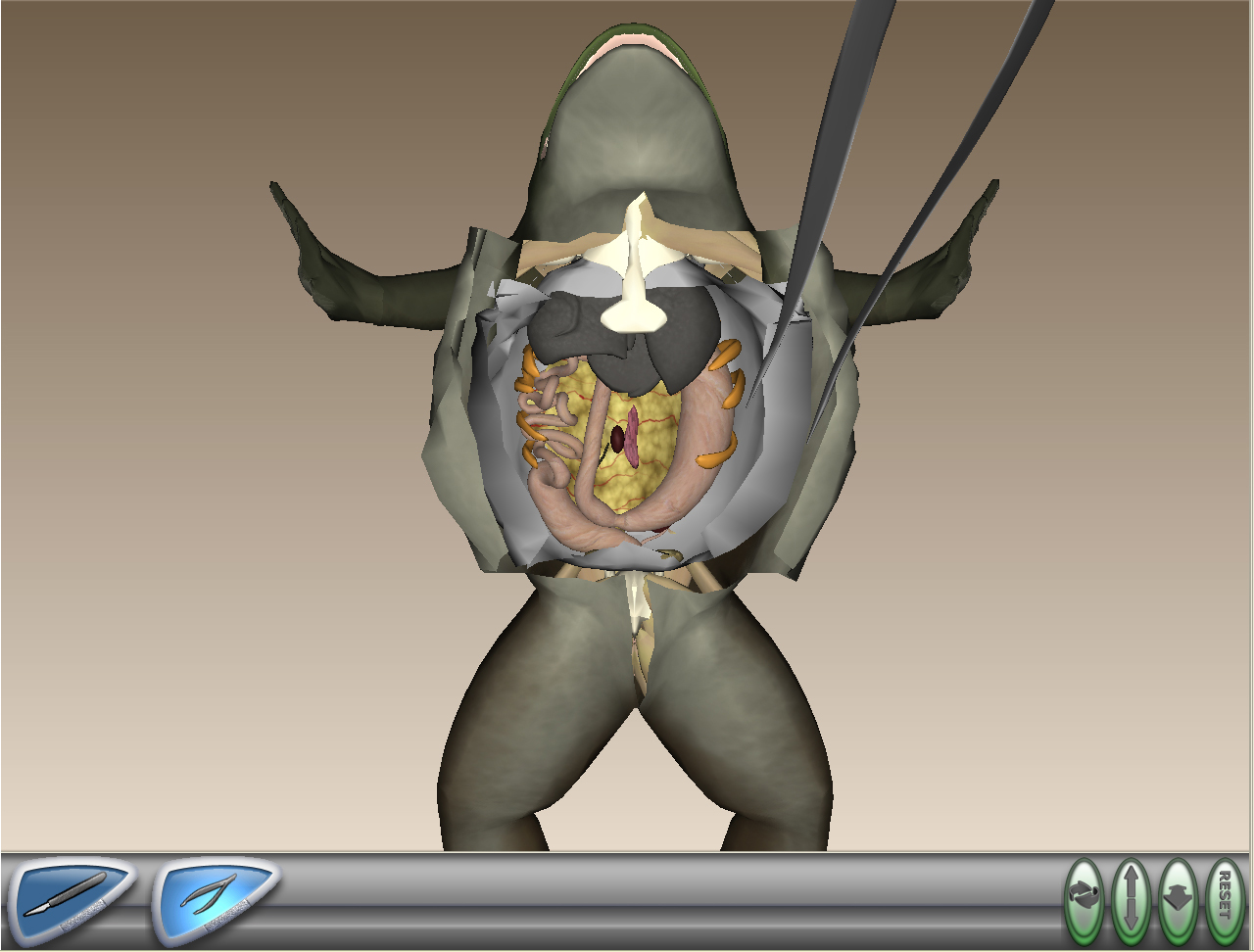 Using a simple mouse and PC, students can "pick up" a scalpel, cut open V-Frog's skin, and explore the internal organs -- with true real-time interaction and 3-D navigation that actually accommodates discovery and procedures not possible with a physical frog specimen.