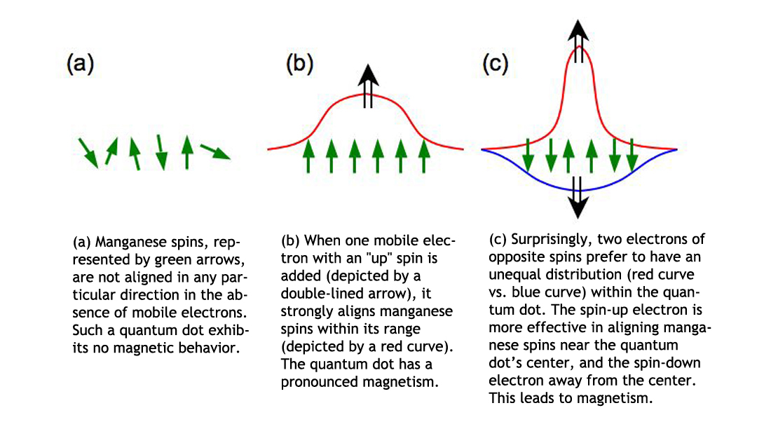 In the "tug-of-war" that ensues, the mobile electron that interacts more intensely with the manganese atoms "wins," aligning more spins and causing the quantum dot, as a whole, to be magnetic. (For a visual representation of this tug-of-war, see Figure 1.)