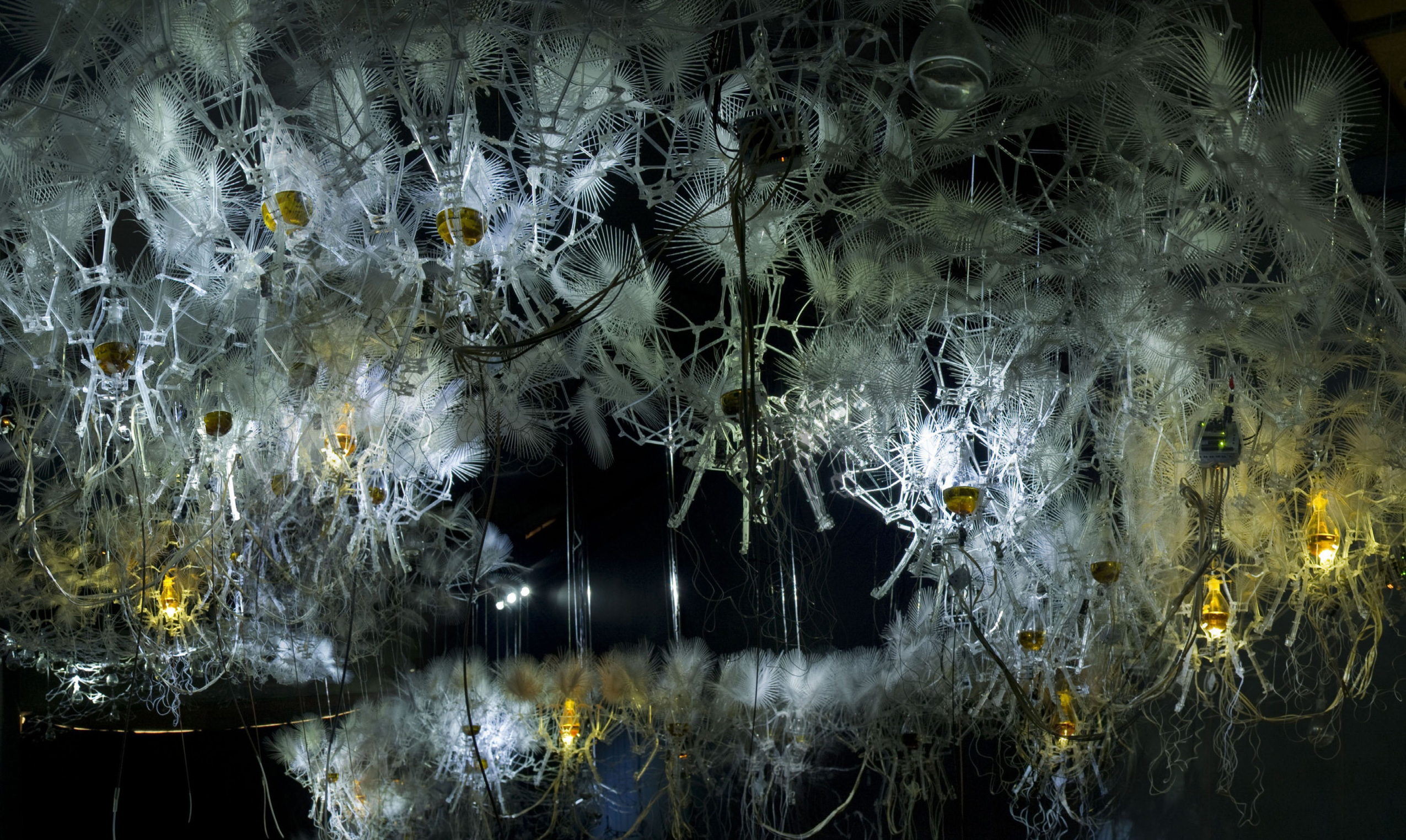This is a region Beesley has explored in his sculpture, notably in "Hylozoic Soil," a place-like organism comprised of layers of man-made tendrils, fronds, webs, bladders and other structures -- all activated in the presence of visitors by embedded micro-controllers, proximity sensors and shape-memory alloy actuators.