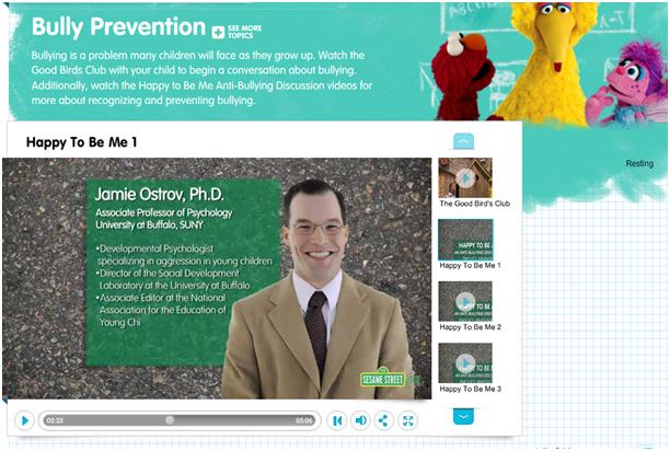 Ostrov's appearance in the videos is on the "Sesame Street" website at http://www.sesamestreet.org/parents/topicsandactivities/topics/bullying.