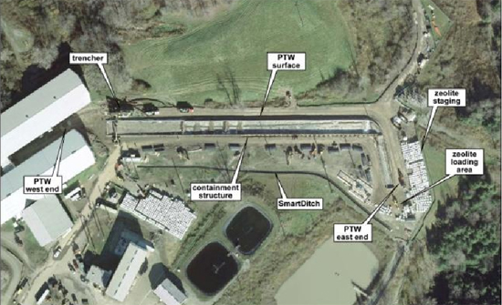 The 3-foot-wide treatment wall at West Valley stretches for 860 feet and extends as much as 30 feet below the ground. The installation contains over 2,000 metric tons of zeolite that captures strontium-90 through a process known as "sorption."