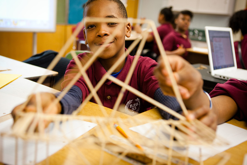 First-graders designed and tested methods of shading classroom windows using three-dimensional shapes in various configurations. Fourth graders built bridges out of sticks and tested them to see how many bricks they would support before they collapsed (seven in one case, one in another), then analyzed the results to understand why.