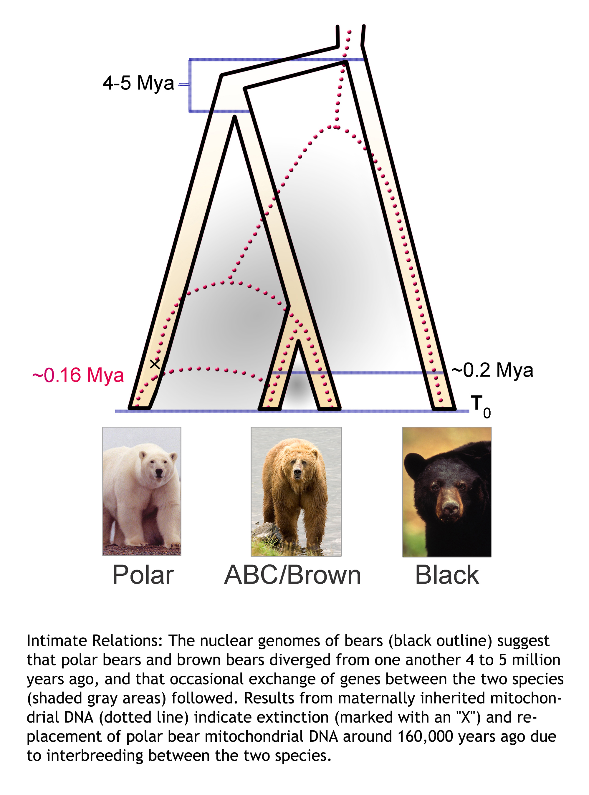 "The ABC brown bears' mitochondrial sequences are much more like polar bears' than like other brown bears'," Miller said. "This made us wonder what other parts of their genomes are 'polar-bear-like.' We mapped such regions, which constitute 5 to 10 percent of their total DNA, onto the genomes of two ABC brown bears. As such, brown/polar bear hybridization, which has been observed recently in Arctic Canada, has undoubtedly contributed to shaping the modern polar bear's evolutionary story."
