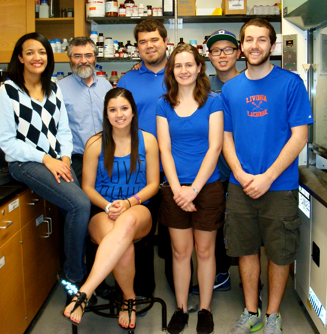 The team of students heading to NASA in their lab with Professor Luis Colón. Left to right: Ivonne Ferrer, Luis Colón, Erika Salem, Nathan Guterry, Sandra Czarnecki, Jimmy Lam and Thomas Prato.