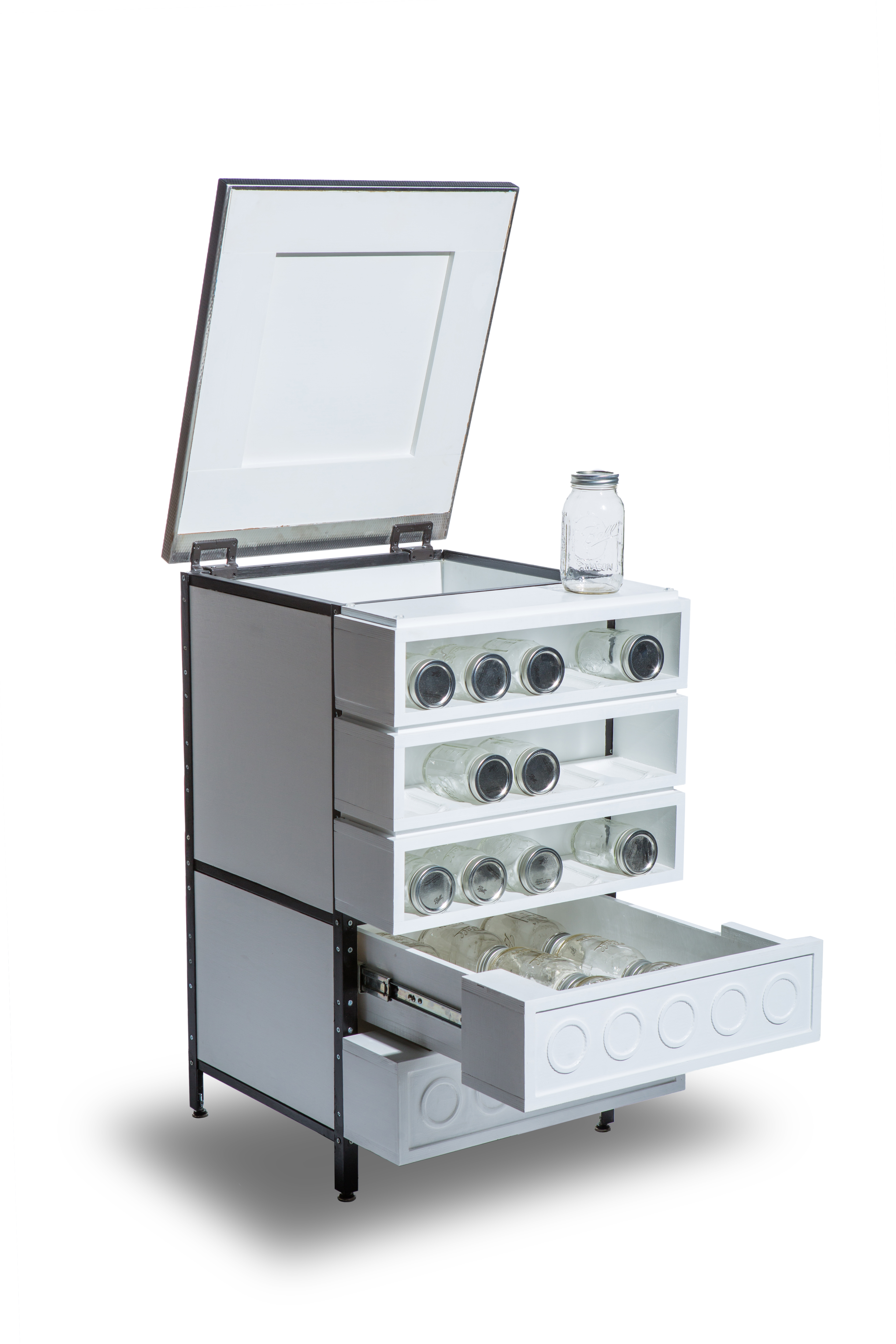 In addition, four wooden shelves feature indentations — milled by a computer-controlled router — for holding mason jars.