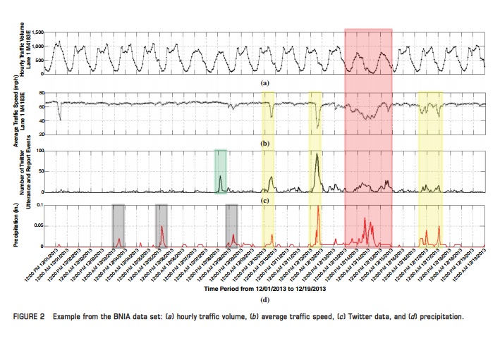 Next, they looked at the timing of the tweets and saw a pattern. When snow falls, the number of weather-related tweets increases, the average motor vehicle speed drops and traffic volumes slowly decrease. (The yellow sections of the graph below show the pattern.)