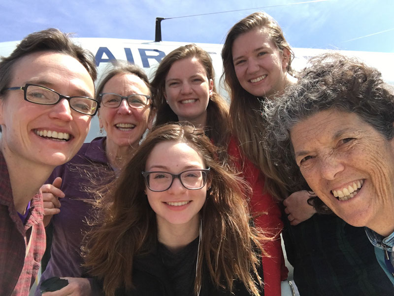 Artist Anna McKee (second from left in back, in purple) joined a UB-led research trip to Greenland in July 2018. The Arctic expedition was headed by Elizabeth Thomas, UB assistant professor of geology (far left). Others on the trip included UB students Kayla Hollister (front), Meg Corcoran (back, in red) and Allison Cluett (back, next to Corcoran); and Margie Turrin, education coordinator for Columbia University’s Lamont-Doherty Earth Observatory (far right). Credit: Elizabeth Thomas