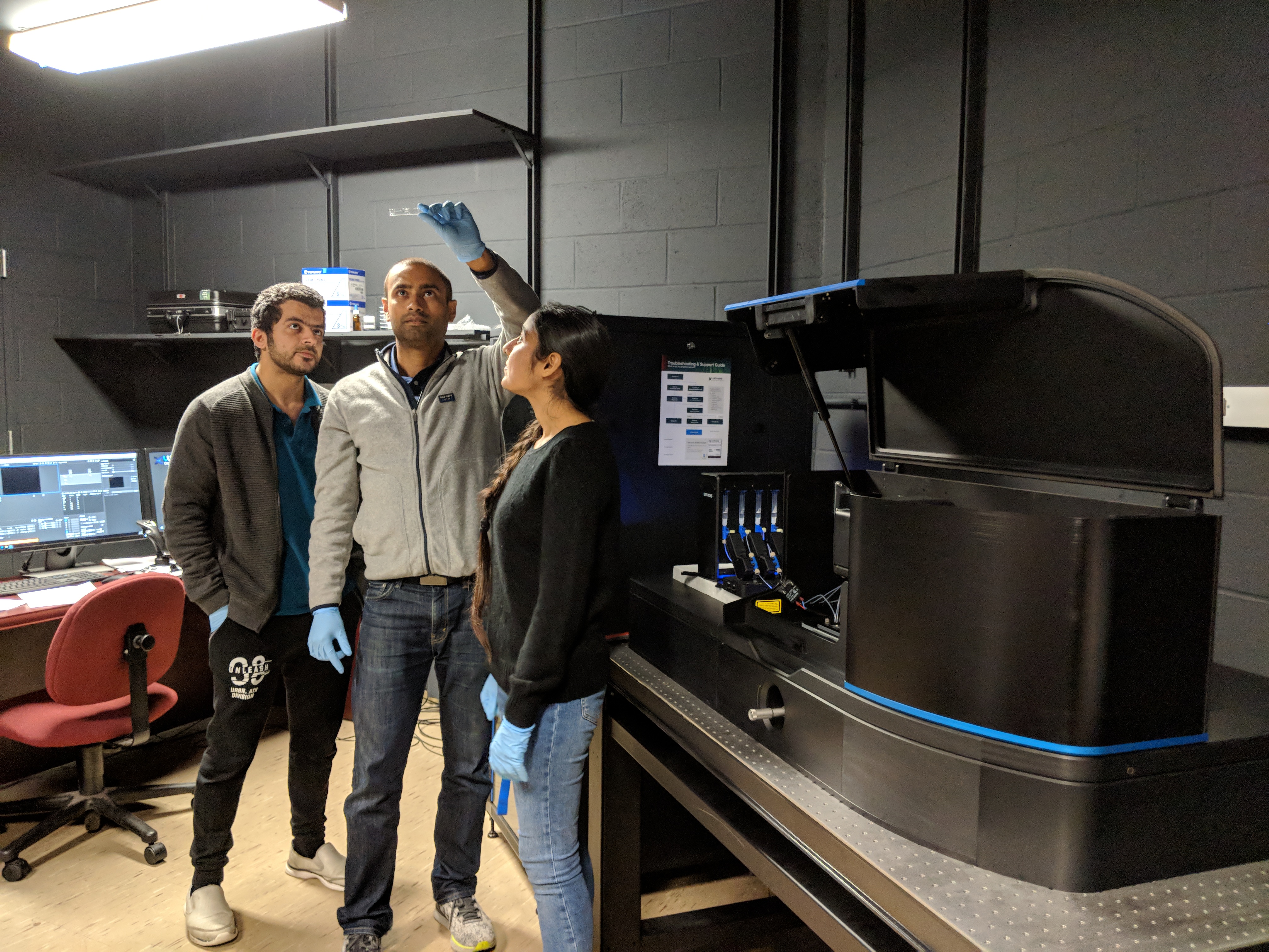 UB Assistant Professor of Physics Priya Banerjee (center) examines a microfluidic chip containing protein droplets in the lab, as UB PhD students Ibraheem Alshareedah (left) and Taranpreet Kaur (right) look on. Kaur was first author of the study, and Alshareedah was second author. Credit: Priya Banerjee Lab at UB