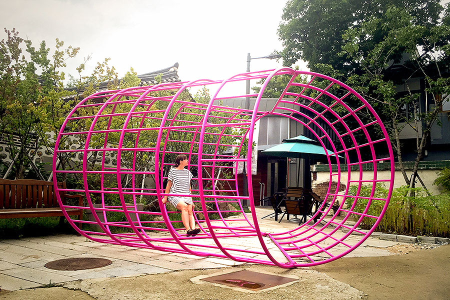 Measuring 14 feet by 16 feet by 8 feet, “Aldo” appropriates van Eyck’s signature climbing frame and reconfigures three of them to construct a striking magenta collective space, a sort of pavilion that visitors are encouraged to occupy and interact with by climbing, leaning and lounging in it and on it. The structure is on display in Donuimun Museum Village in Seoul.