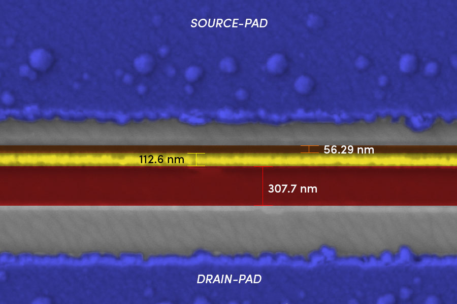 Transistors are the building blocks of computer hardware. Smartphones have billions of them. This image shows a gallium oxide transistor created with an electron beam lithography (EBL) system. The gate (the yellow line) is about 100 nanometers wide — a typical sheet of paper is 100,000 nanometers thick. This is an example of the extremely tiny structures that can be fabricated with EBL systems. Credit: Uttam Singisetti and Abhishek Vaidya, University at Buffalo.