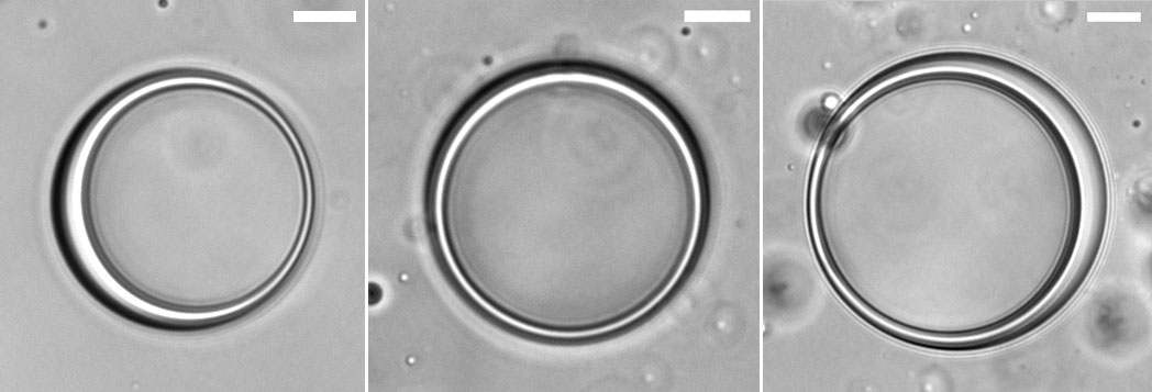 Differential interference contrast microscopy images show protein-RNA vesicles created in the lab. The vesicles — hollow, spherical sacks — were made without traditional lipid building blocks. The scale bar shows a length of 10 microns. Credit: Ibraheem Alshareedah