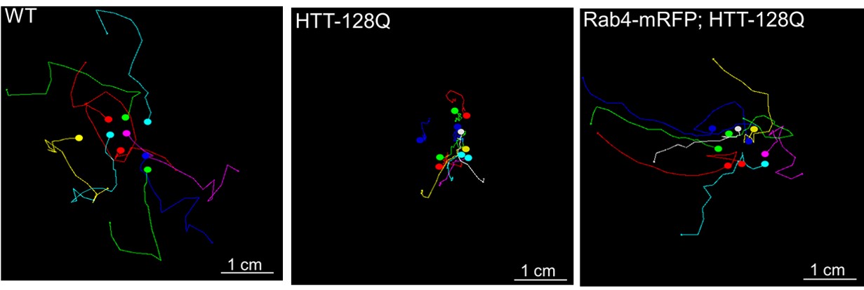 Colored lines show the paths of crawling fruit fly larvae. Larvae with a mutant form of the human huntingtin protein that causes Huntington's disease crawled poorly (center) compared with normal larvae (left). But when larvae carrying the Huntington's disease protein also produced extra quantities of the Rab4 protein, crawling improved, though not completely (right). Credit: White, J.A., Krzystek, T.J., Hoffmar-Glennon, H. et al., Acta Neuropathologica Communciations, July 2020. The image is adapted from a graphic in the journal article, which is distributed under Creative Commons Attribution 4.0 International License.