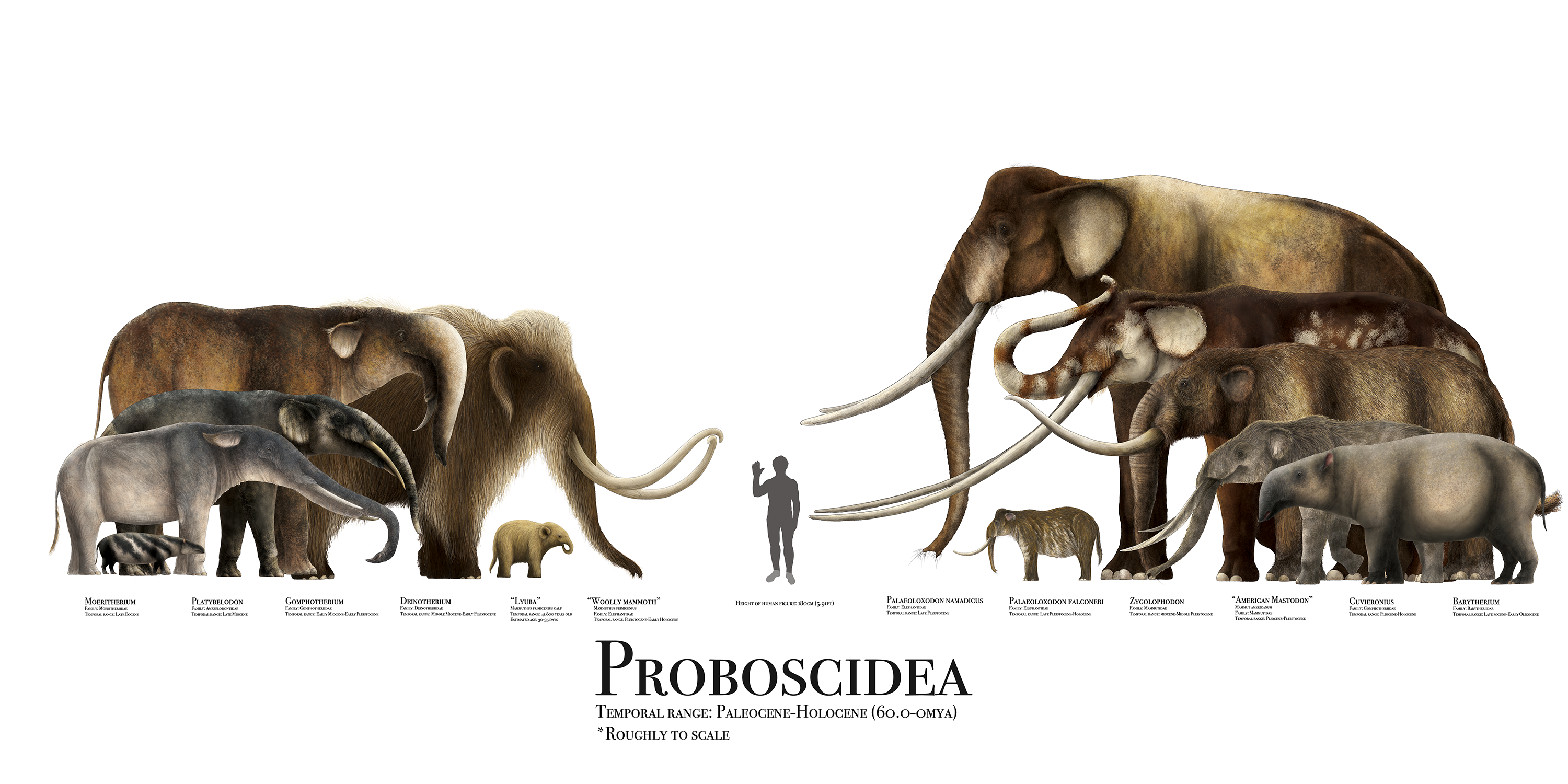 Artist's illustration of species within the taxonomic order Proboscidea, which includes elephants. Credit: Liam Elward